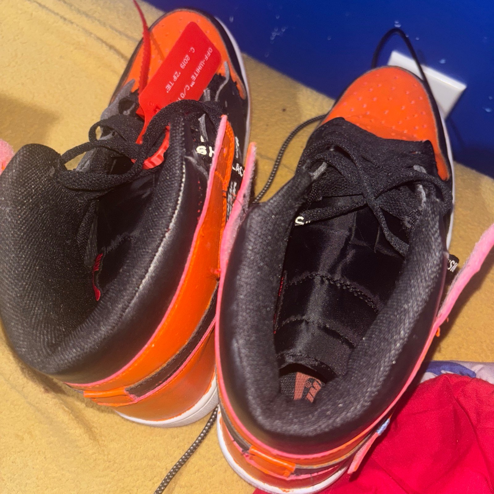 This is a pair of Air Jordan 1 Retro High OG sneakers in a multicolor solid pattern. They feature a high-top shoe shaft style with a lace-up closure and cushioned comfort. The shoes are designed for men in a UK shoe size 7.5 and US size 8.5, with a standard shoe width. Made of leather, these athletic sneakers are part of the Air Jordan product line, embodying a retro theme and suitable for activities like school. Signed by No, they come in their original box and are new.