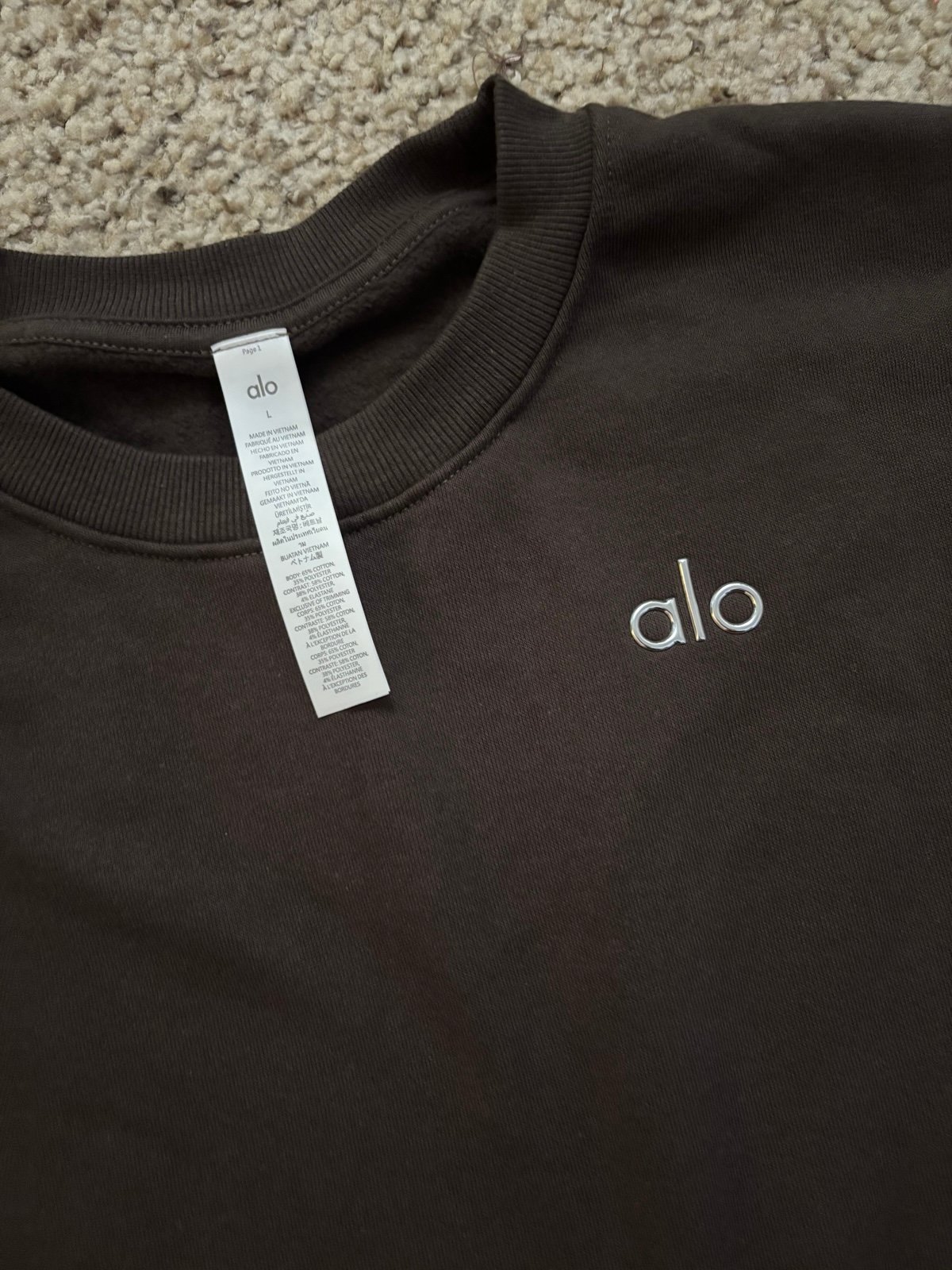 Cozy and minimalist Alo Accolade Crewneck in rich espresso brown.