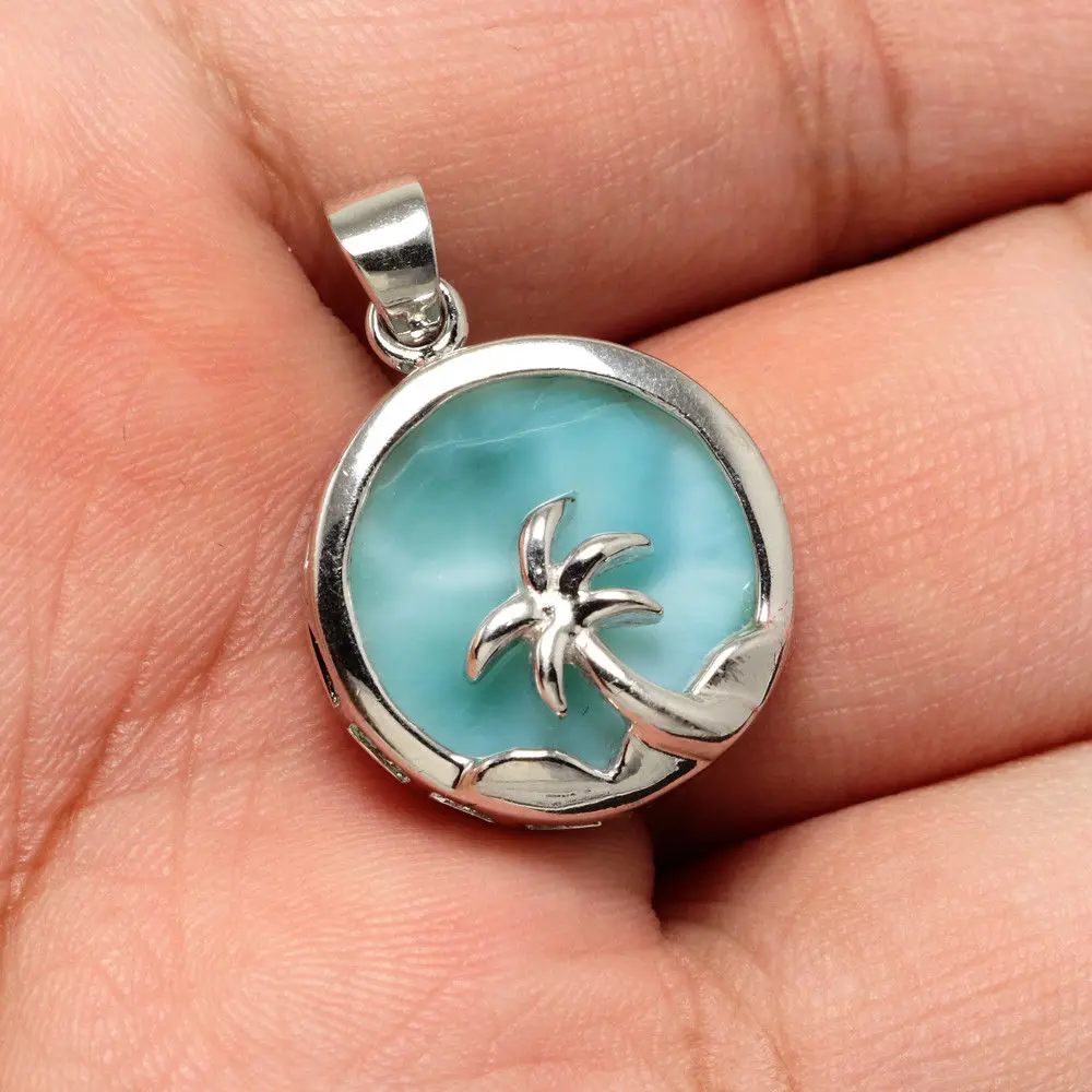 Beautiful Women's Jewelry 925 Sterling Silver Blue Natural Larimar Palm Tree Ocean Pendant Necklace For Gift