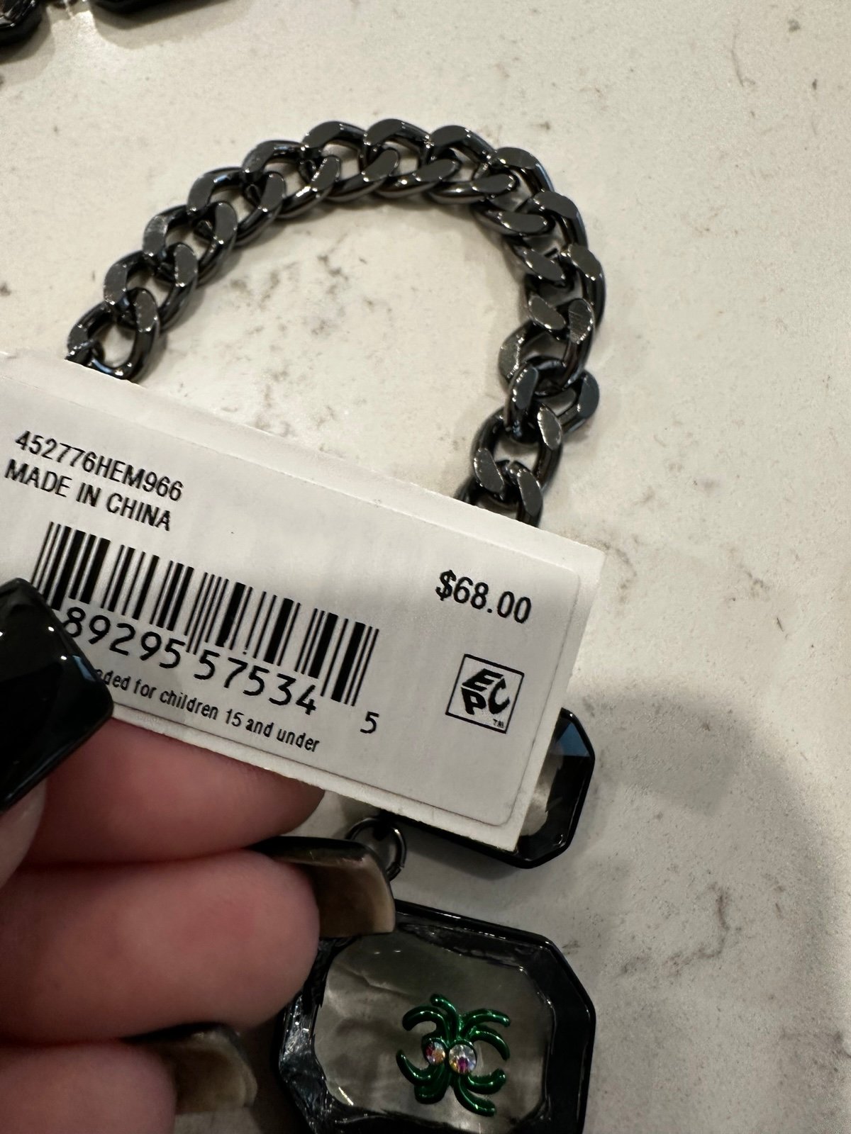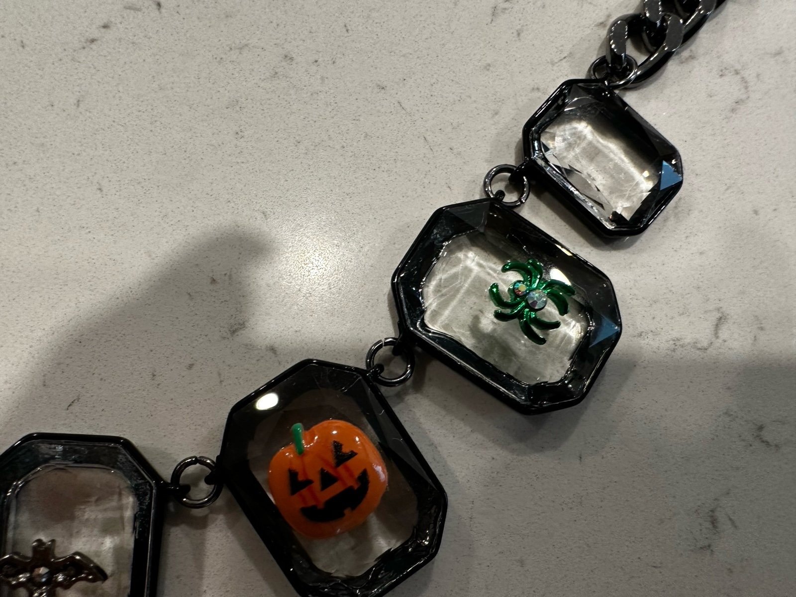Betsey Johnson Halloween Necklace and Bracelet Set. This set has black chain and metal pieces with clear stones and little Halloween gems on most of the stones including; skull and crossbones, candy corn, bat, pumpkin and spider. Brand new to tags attached.