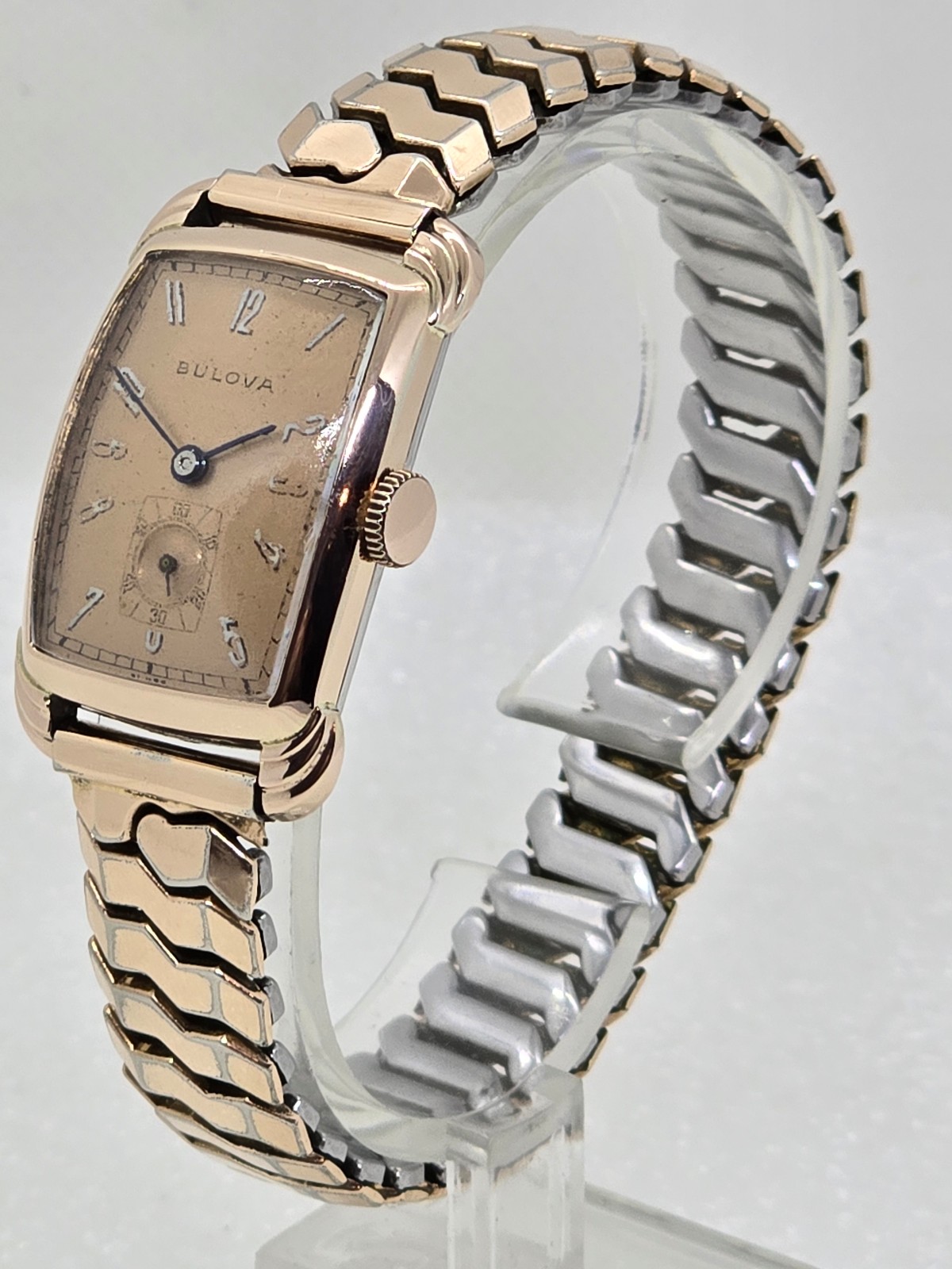 Beautiful vintage 1946 Bulova Senator. 14K rose gold (RGP). With a vintage 10K rose gold (RGF) Golden Knight flex band. Has been serviced and runs very well. It shows some minor signs of wear as you would expect with a vintage watch like this.