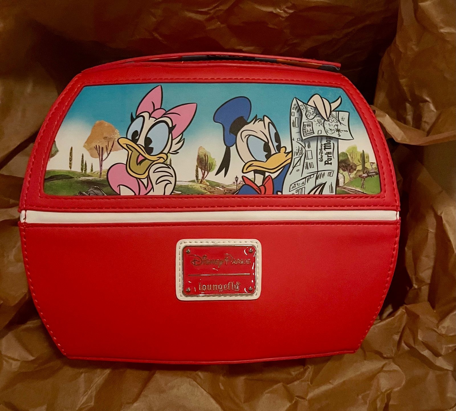 The 2025 Disney Parks Skyliner Loungefly Crossbody bag is medium-sized featuring a magnetic top closure and a super cute print inside featuring various Disney characters riding the Skyliner. This bag is designed with the iconic characters Mickey, Minnie, Donald, Daisy, Pluto, and Chip & Dale on the exterior.