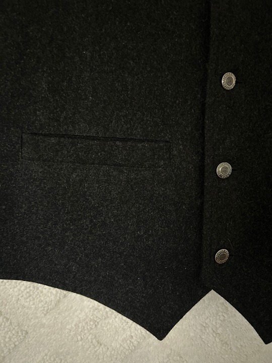 Men's Powder River Outfitters dark charcoal gray (almost black) button up western style vest labeled a size Large (may fit smaller, see measurements below) in good "pre-owned" condition with no rips, stains, or tears observed. Vest exterior is made of 80% wool/20% nylon, lining is made of 100% nylon. Vest has a 5 metal buttons, 4 fake front pockets, comfortable lining, and elastic strip on the back, see pictures for more details. Measurements were taken with item on a hanger, armpit to armpit 20.0" (fully buttoned), top to bottom front 20.0" (v-neck to lower front tips), and top to bottom back 27.0"(top of collar to bottom center).