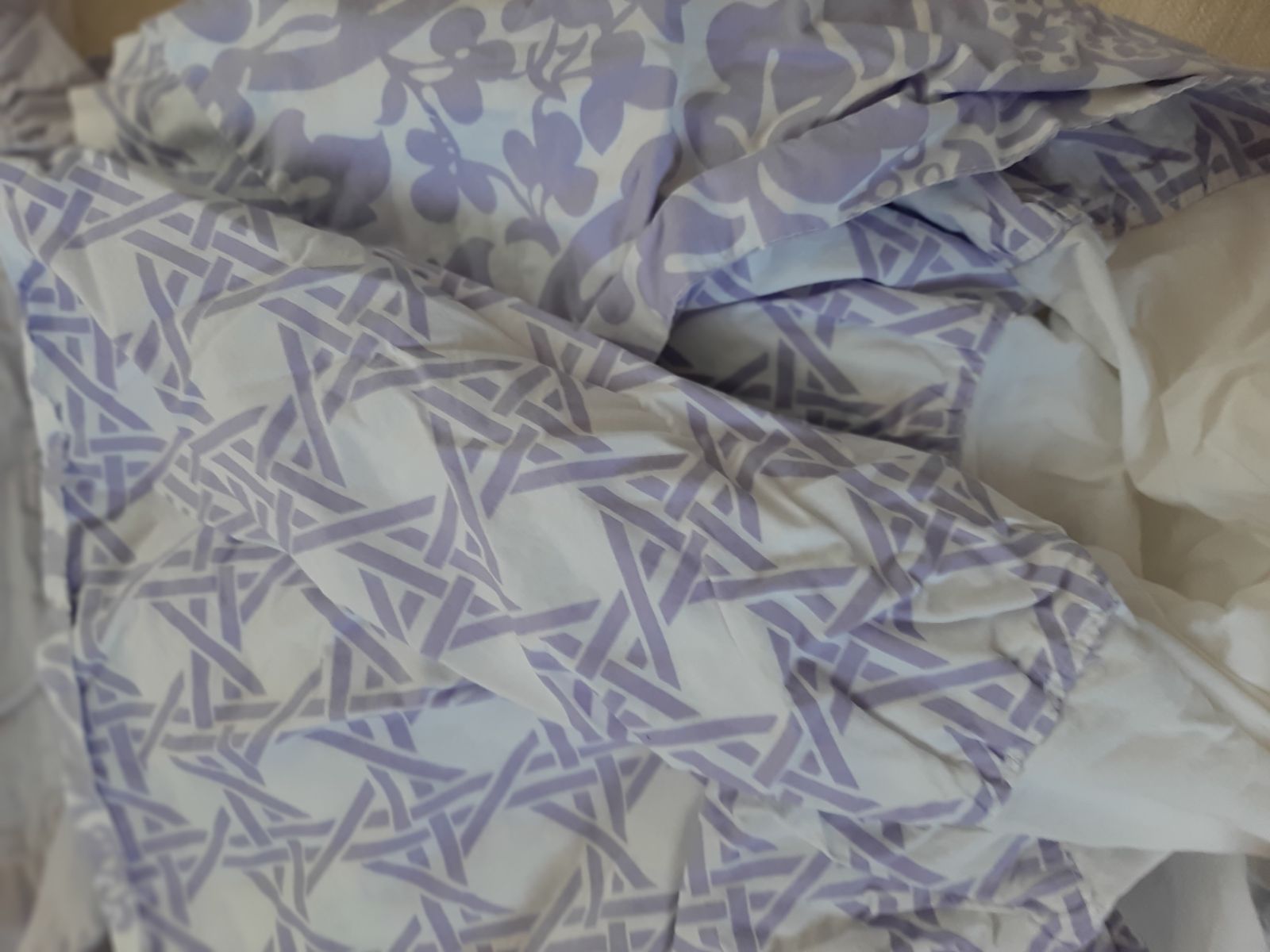 Beautiful crib skirts. Like new, washed but don't think we ever used. Beautiful light purple and white colors. Ruffle collection, Harper stripes, & 1 is reversible with floral and geometric type patterns. Cotton feel. Fits with crib/toddler bed size. Bought for over $280.