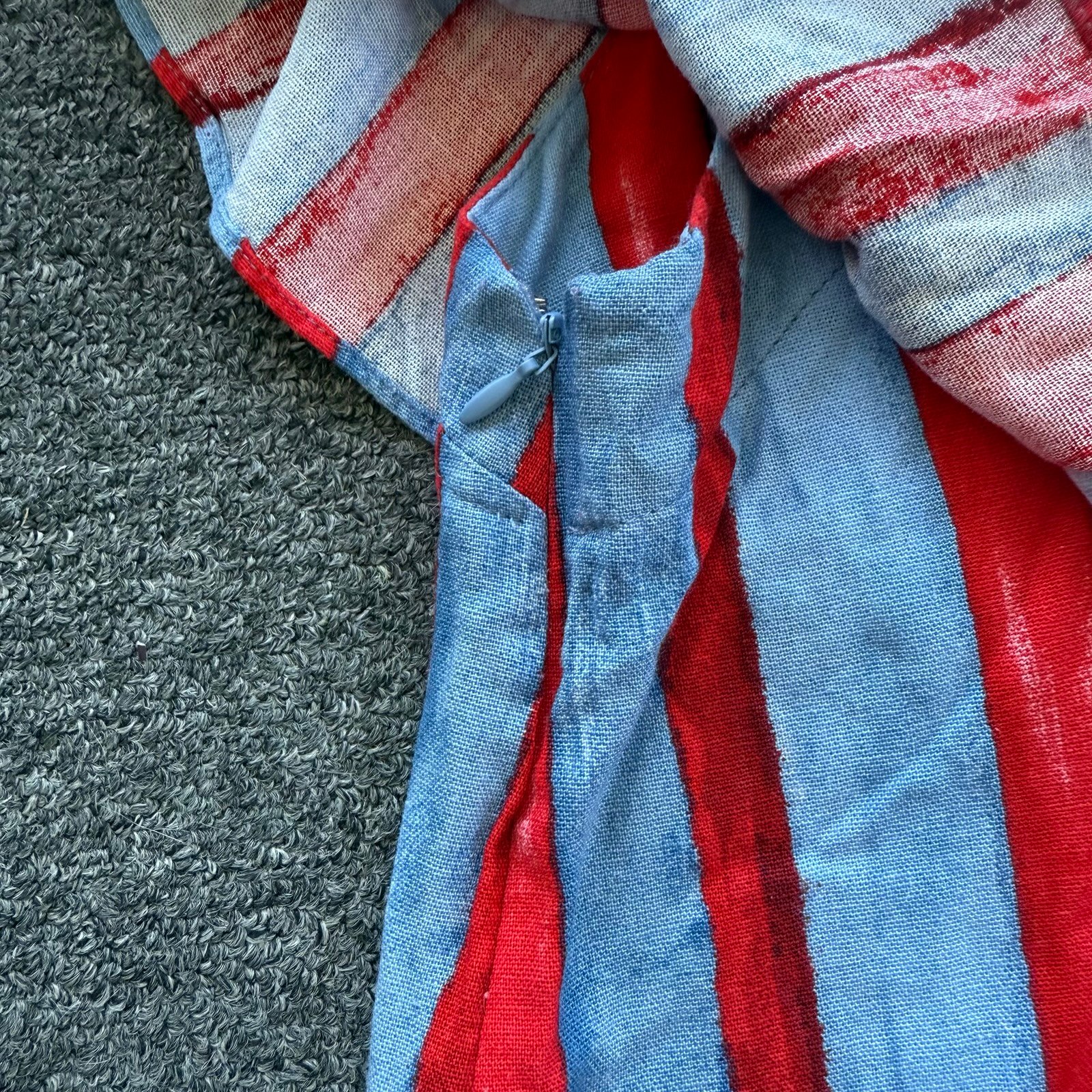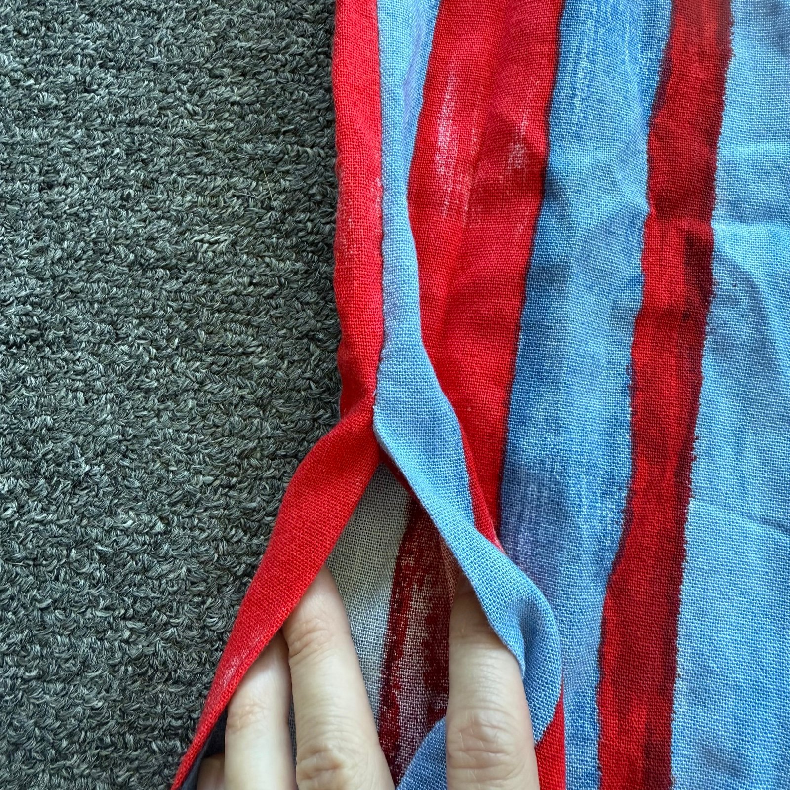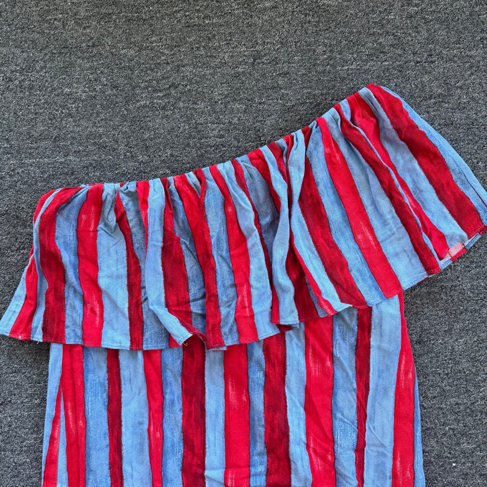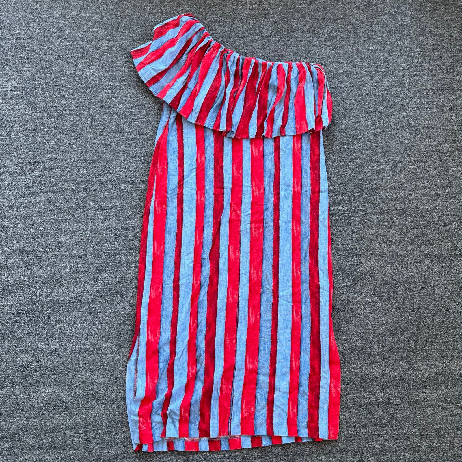Red and blue vertical stripe midi dress. One shoulder with ruffle bust detail. Side slits and hidden side zipper. Linen/rayon blend. Excellent condition save repaired seam at slit.