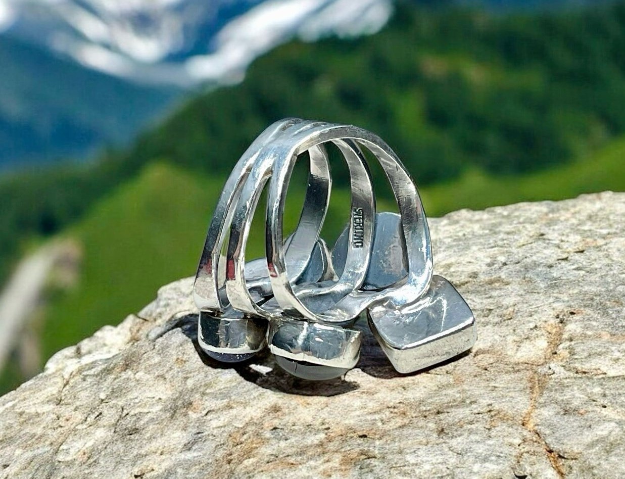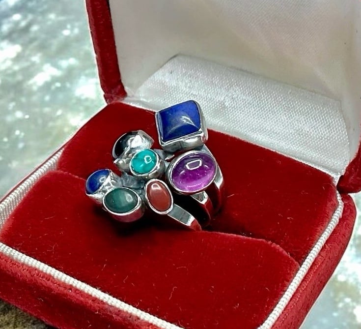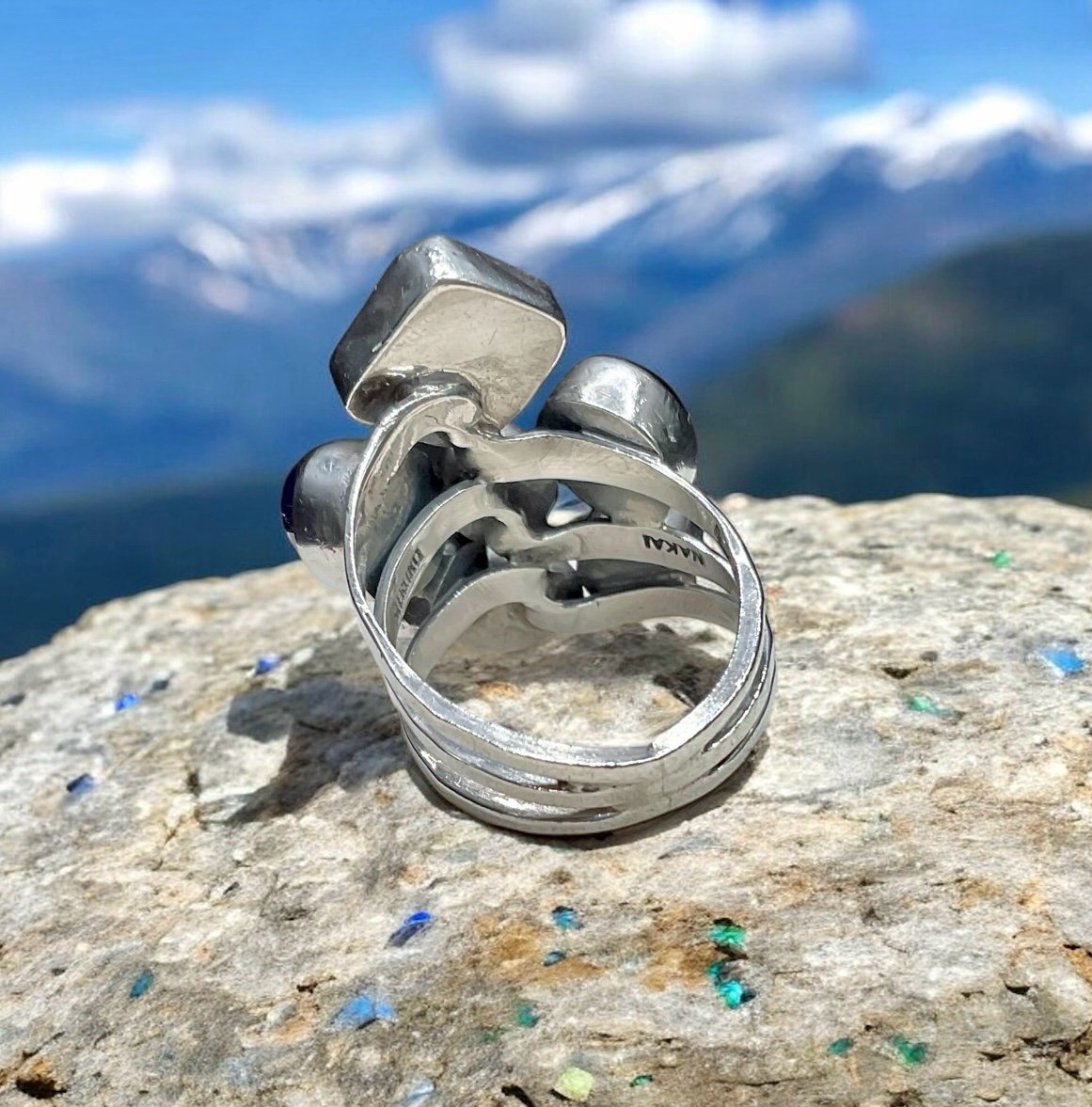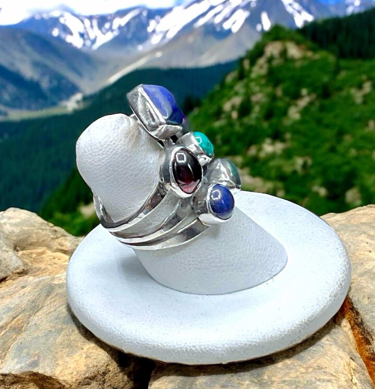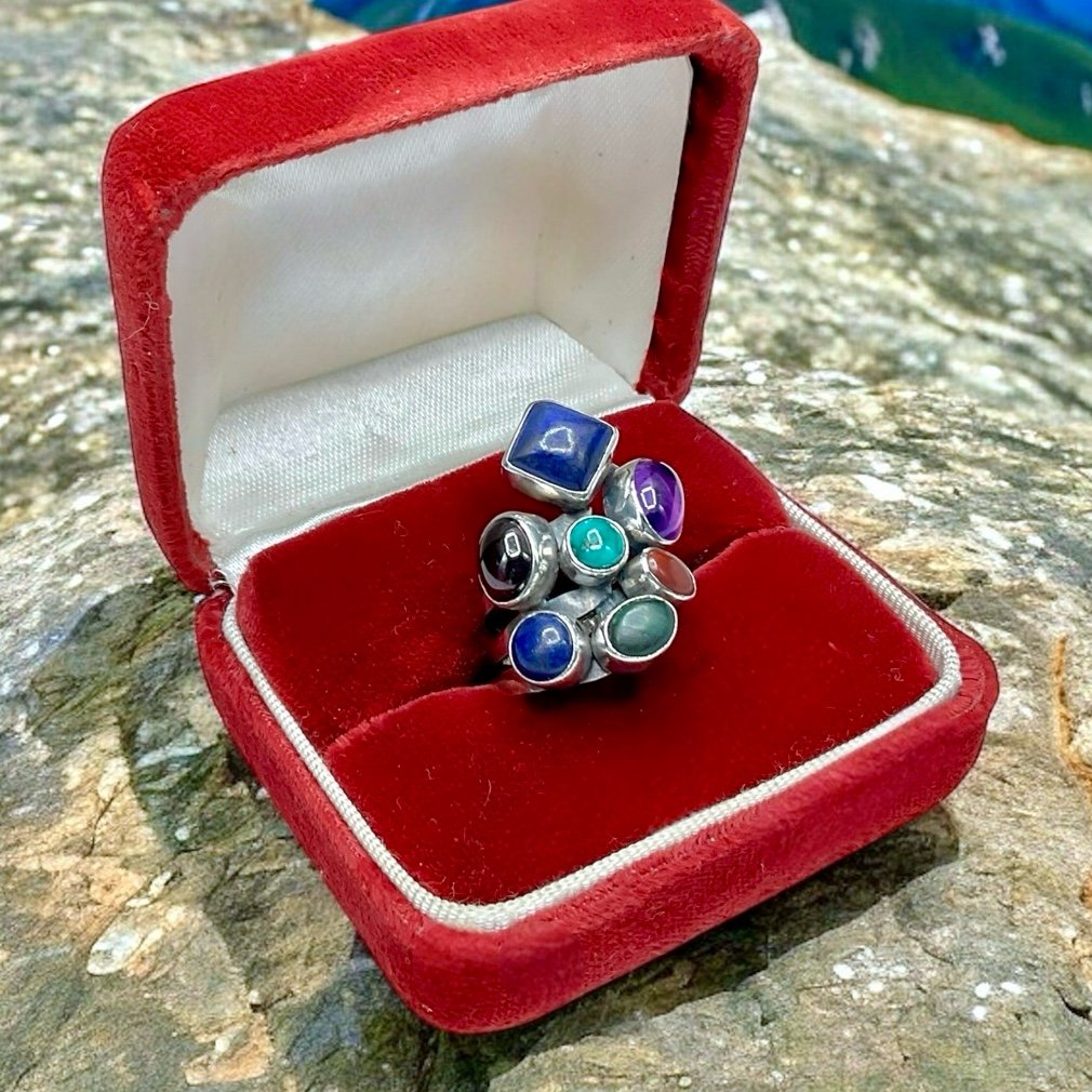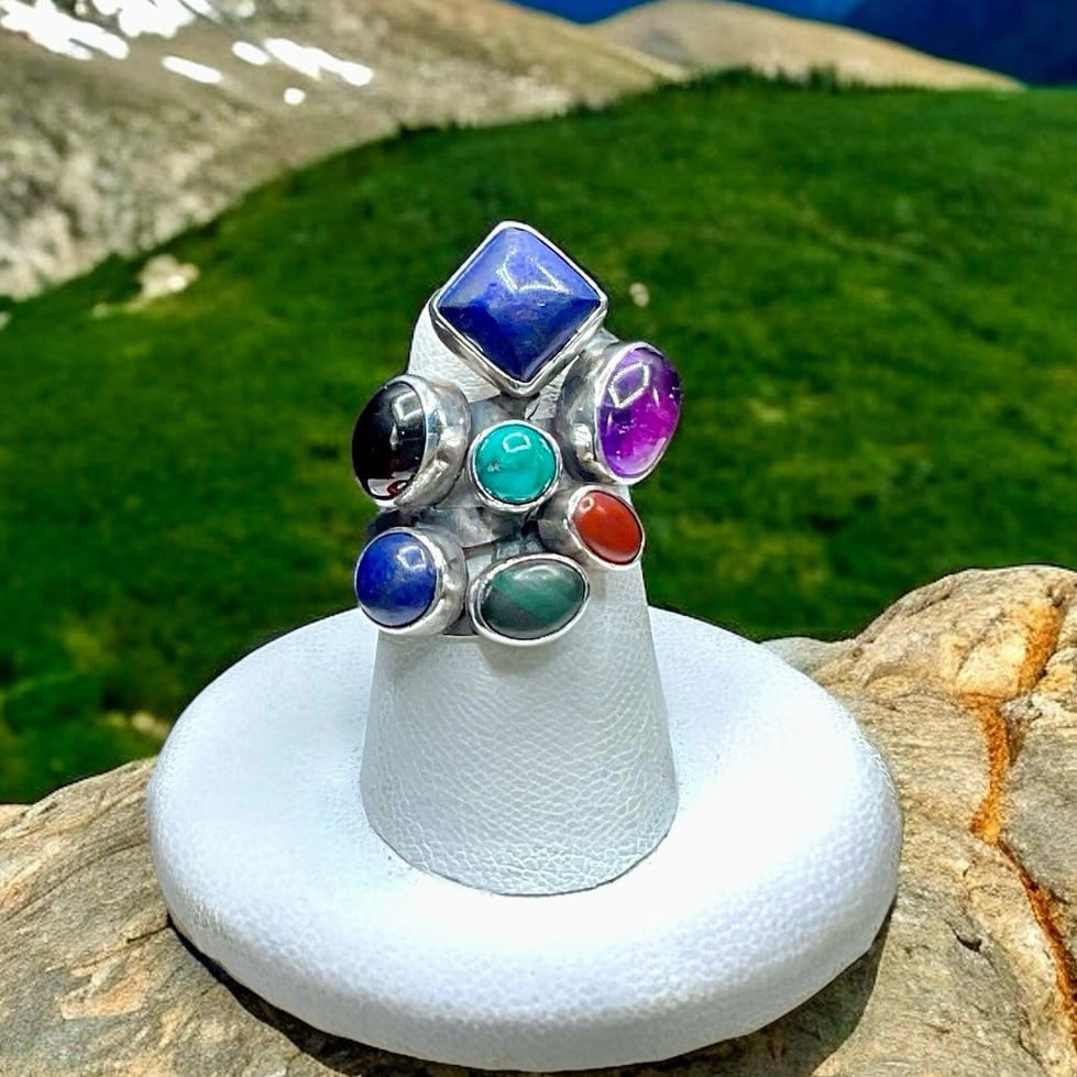 Vintage Native American Nakai Sterling silver and multi gemstone ring. The gorgeous piece has multiple gemstones, including turquoise, amethyst, lapis, coral, garnet and malachite. Each gemstone is in a tube bezel and set a top a three split ring shank.. It is Hallmarked, Nakai, Sterling and is a size 6.5 on my ring madrel. Nakai jewelry is made primarily in the southwest by Native American artists. The Nakai name is Navajo and means "unknown ones". This is one beautiful piece!