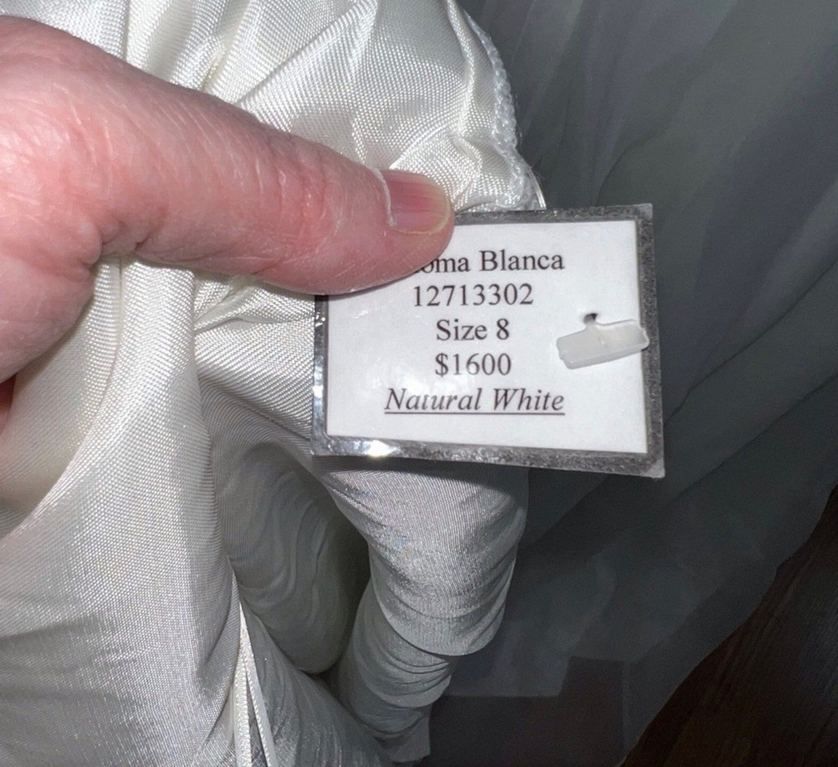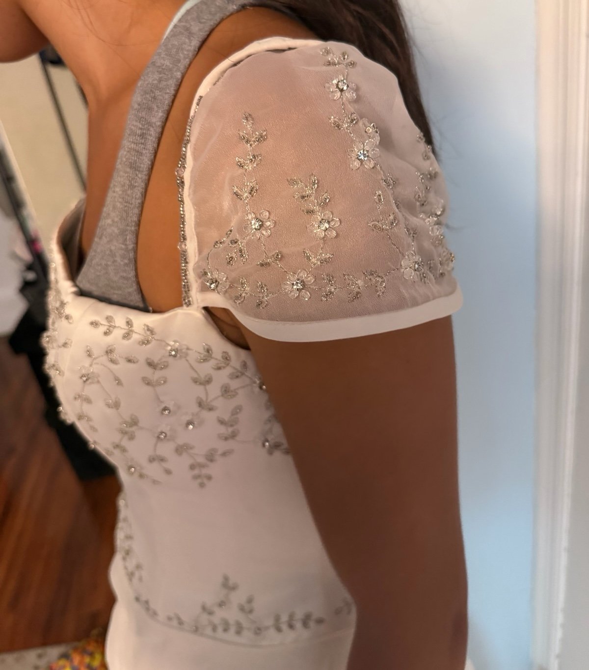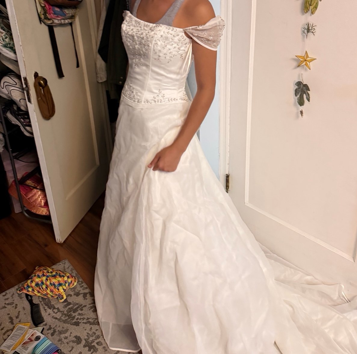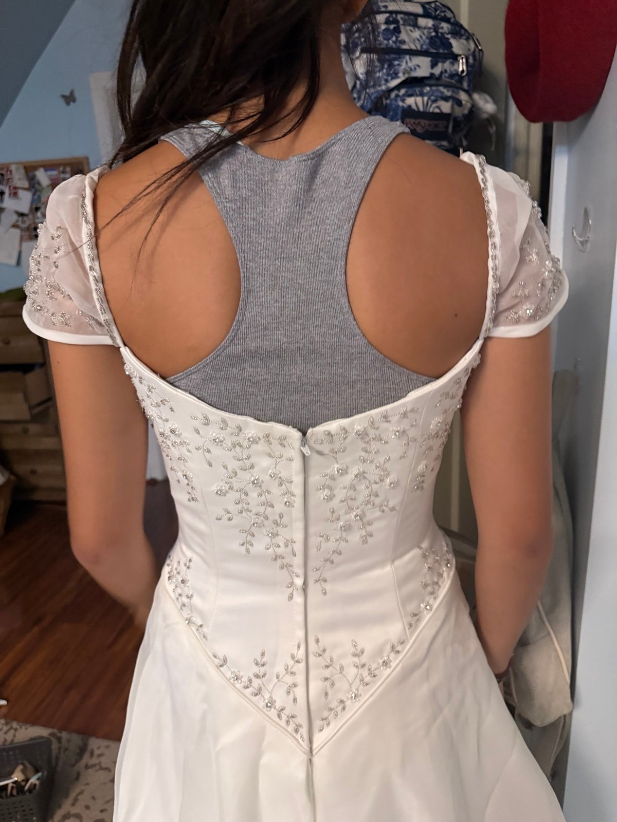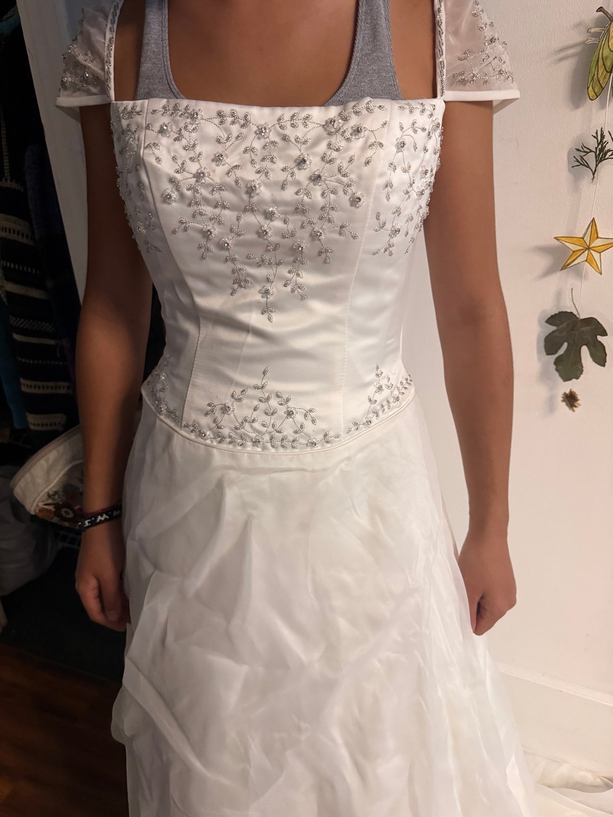 This gown is so gorgeous! I love the jeweled cap sleeves! Gown has a sales tag but appears to have been worn/tried on and may need dry cleaning. Bust measures 33”, waist is 28”, length is 60”
